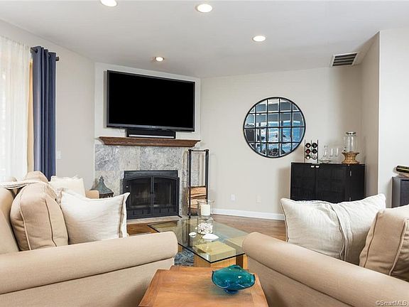 Sophisticated three level townhouse in waterfront community. Prepared to be "wowed" in this totally renovated elegant unit with high end finishes. Gleaming red oak wood floors on 2 levels (2nd bedroom is additionally fully carpeted and the upper level family room is fully carpeted as well. The open concept main living area features new sliders to deck, living room with wood burning fireplace, spacious dining area, gourmet kitchen with quartz topped breakfast bar, counters and center island, stainless steel appliances, and custom maple cabinets. Lovely renovated powder room completes this level. Cat6 wifi and internet enabled in all rooms. Large master bedroom with new California closets and custom bathroom featuring spa-like natural stone shower with dual head rain shower. Second bedroom with large California closet has it's own full bath with shower/tub combination. All bathrooms have heated floors. Sun drenched Vaulted family room on upper level has 4 skylights and pull down attic. Could be a 3rd bedroom. Detached garage, and one reserved parking space come with this unit. Pool in complex overlooking park area and marina. Walk along the new Boardwalk to restaurants, John Boccuzzi park, and water taxi to Harbor Point. Convenient to shopping in Old Greenwich, either Stamford or Old Greenwich Train Stations, vibrant downtown Stamford, Harbor Point and I-95