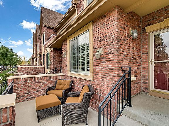 Rare mountain views! Spacious, private, end unit Evanston model Brownstone. This home boasts a gorgeous gourmet kitchen with slab granite counters and island, cherry cabinets, stainless steel appliances, gleaming hardwood floors, breakfast bar and large pantry. Open floor plan features plantation shutters throughout main floor. Main floor 3rd bedroom could serve as an excellent office space. Large owner's suite has a walk-in closet and ensuite master bath with granite counters and dual vanity. 2nd bedroom and loft have fantastic mountain views and plenty of natural light. Loft could be a great office area or 2nd living room. Laundry is conveniently located upstairs. Unfinished basement plus huge, climate controlled storage crawl space. Front gated patio and rear, private courtyard are excellent for entertaining and enjoying our beautiful Colorado outdoors. Walking distance to Civic Green Park, Highlands Ranch library, shops, restaurants, pubs and public transit. Close to extensive hiking, biking and running trails and four Highlands Ranch Recreation Centers. Conveniently located to C470 and Highlands Ranch hospitals. Enjoy maintenance-free living in an excellent location!