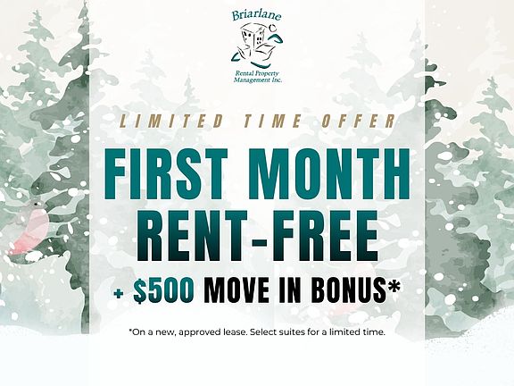- Special offer! FIRST MONTH RENT FREE + $500 MOVE-IN BONUS - Receive your FIRST MONTH RENT FREE + $500 MOVE-IN BONUS! This limited time offer is available for new applications on select suites with a 13 month lease term. Contact our leasing agent for further details!