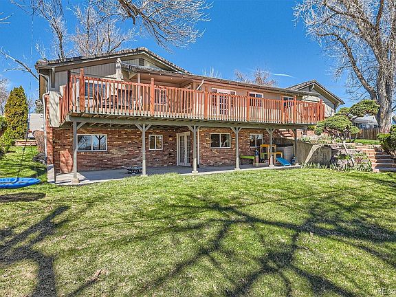 LOCATION, LOCATION, LOCATION! This stunning ranch home sits on an unbelievable quiet interior lot just steps from multiple open space parks, Eagle Trace golf Course, recreation centers, great highway access & a multitude of schools. This completely updated beauty features tons of natural light, fully finished walk-out basement, custom garage door, pave-stone driveway, RV parking, concrete tile roof (save $ on insurance), 5 beds, 3 baths, wrap around brick facade, huge deck & beautifully landscaped yard! The main level boasts Mahogany wood floors, huge family room allowing for multiple furniture configurations, brick feature wall w wood burning fireplace, large formal dining space, updated kitchen w eat-in dining all overlooking the amazing back yard. The main level is completed w 3 large bedrooms & 2 full baths, 1 being a private en-suite bath in the fantastic Owner’s Suite! The gorgeous kitchen includes slate stainless appliances, slab quartz counters, 42” maple cabs & farmhouse sink. The professionally finished walk-out basement is not to be missed! The large open great room features a motorized movie screen, projector, built-in surround sound, custom built-in entertainment center/storage & tons of room for entertaining. The bonus area in front of the brick feature wall w gas fireplace insert is the perfect place for a cozy conversation pit. You’ll also find in the basement 2 large guest rooms (1 featuring a custom built Murphy Bed & new vinyl flooring) w natural light, a remodeled bath & laundry room w tons of storage & utility sink. Need storage? Great storage room w tons of cabinets make storage a breeze. This home is truly amazing & an entertainers dream w a yard & garden areas anyone can enjoy & open spaces throughout the home. Enjoy all that Colorado outdoor living affords with beauty and privacy! The garage is oversized with additional storage space or room for a workshop. This home is absolutely move-in ready, just put your furniture down and enjoy!