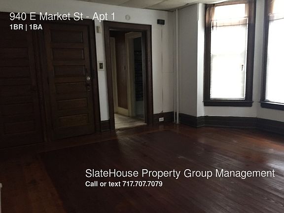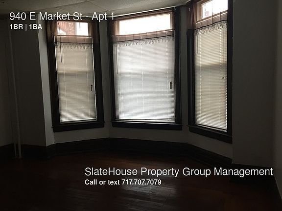 SCHEDULE A SHOWING ONLINE AT: showmojo.com/lh/b99044702c First floor living at its finest! This property features beautiful hardwood floors throughout, large eat in kitchen with plenty of cabinet space, tons of natural light, full bath, large yard, and appliances are included! Check out this 2nd floor 1 bedroom apartment on E Market St. Property features hardwood floors, ceiling fans, galley style eat in kitchen, full bathroom, and private balcony. Garage space for rent if interested for an additional $65 a month We can schedule an appointment to show you the property. If you like what you see you would need to fill out an application on our website. There is a $25 application fee and that is per adult who would live in the unit. We do run a credit check and a background check. All applicants must have a good previous landlord reference, no recent evictions, and the rent would need to be a third of your total household income (rent x's 3 = monthly income). This property is not approved for pets. Once your application is approved, a first months rent is required to hold the property for you - we can hold the unit for up to 30 days. At the end of that time you would pay your security deposit (equal to 1 months rent), and have the gas and electric fully transferred into your name in order to move in. Utilities included in the lease: Water, sewer, trash Utilities paid by Tenant: Electric, gas Appliances Included: Refrigerator and Range Sorry but this is not currently Section 8 Approved 1st month rent is due at signing. 1 Month Security Deposit at move in date. Poorly qualified applicants, if approved, may be required to pay first and last month rent at move in date. Free online rent payments. To Schedule a showing please either: schedule online at http www.slatehousegroup.com/homes-for-rent or call 717-707-7079 - 24/7 or click the clickable button on this page for more information Cats Not Allowed Dogs Not Allowed
