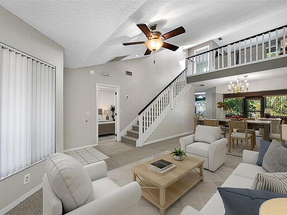 One or more photo(s) has been virtually staged. Discover your affordable dream townhome in the ideal location! This spacious gem boasts two luxurious primary suites (one on each level), 2 full bathrooms, a versatile loft, and a bonus room. Brand-new roof (2023) and updated AC condenser (2019). Stunning curb appeal with an inviting front porch that is ideal for cozy firepit gatherings or stylish outdoor seating. Step inside to soaring vaulted ceilings that create a bright, open floor plan, with the upstairs loft offering a dramatic overlook. Fresh new flooring and paint throughout the living areas and bedrooms. The downstairs guest suite is a retreat in itself, it is generously sized with a walk-in closet and a private vanity room leading to the fully remodeled guest bathroom featuring sleek, modern finishes. The functional kitchen offers stainless steel appliances, a cozy eat-in nook, and a handy built-in desk, ready for your personal updates while keeping meals flowing smoothly. A flexible bonus room off the back awaits your vision: home office, cozy den, extra lounge, wet bar, or whatever inspires you! Upstairs, the expansive loft creates two distinct living areas and opens to a private balcony with views of the 18-acre Douglas M. Cooke Community Park—complete with playgrounds, walking paths, picnic spots, dog areas, football field, basketball courts, and baseball fields. The oversized primary suite pampers with a walk-in closet featuring custom built-ins, plus an en-suite bath with a built-in vanity and a private shower retreat. Enjoy the benefits of this well-maintained community with a low HOA fee of just $175 per month. Prime convenience: minutes from shopping, dining, and everything you need, plus just 4.7 miles to vibrant Downtown Lakeland where you can stroll along Lake Mirror for sunset swan boat rides, catch a show at the historic Polk Theatre, sip craft brews at Swan Brewing, savor farm-to-table fare at trendy spots like Nineteen61 or The Joinery, shop one-of-a-kind boutiques, enjoy Munn Park concerts and farmers markets, or paddleboard on Lake Morton amid iconic swans. Under 40 minutes to Orlando and under 45 minutes to Tampa for theme parks, international airports, pro sports, and big-city excitement. Your perfect home awaits!