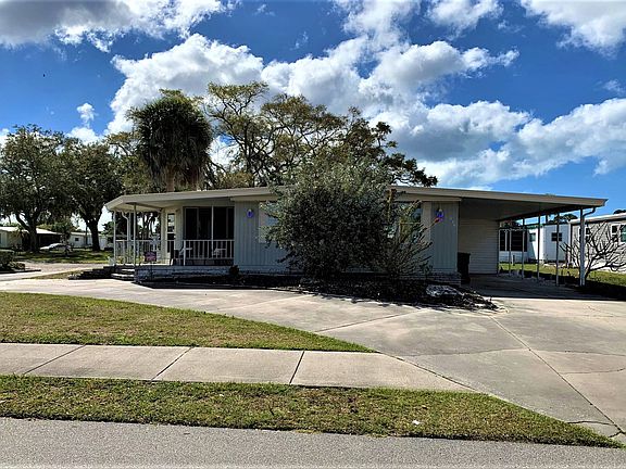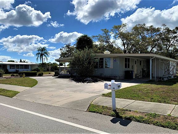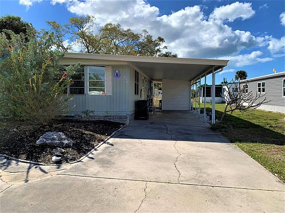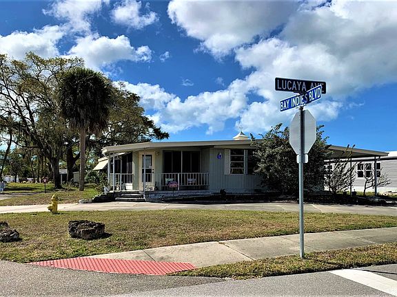 MOTIVATED SELLER! REDUCED PRICE! Check this one out..Options galore come with this uniquely large 50X24, 2 bedroom, 2 bath home located on an easy care, corner lot with a circular drive and also a covered carport. This home resides within the boundaries of the Bay Indies 55+ Community but also has some additional amenities allowed such as motorcycle/scooter and trailer approved. The unusual double lanai's are separated with a set of sliders with open views and tiled floors. One section has a set of side by side windows and screens and under air. This section leads to the living area. The second lanai has jalousie windows and screens and sits off the guest bedroom. Entering the home is the great room with numerous windows and plenty of room to arrange however you like. There are also choice opportunities for den/office areas in a number of rooms. Adjacent is the dining room and kitchen which benefit from lots of light. There is recessed lighting throughout as well as laminate wood flooring. The A/C trunk lines under the home have been replaced, newer A/C, a 30 gallon hot water heater and the roof has been recoated. The bright white kitchen has newer stainless steel appliances, a mother-of-pearl backsplash, new countertops, large doublesize sink with new disposal and a pantry. The guest bath has a tiled floor, new tub with overhead shower, vanity and a tiled backsplash with raised sink. There is also a utility closet located in the hallway. The guest room has a set of bay windows with a beautiful view of the Bay Indies Veterans park, double closet and room for twins or queen sleeping. The master has two closets with a built-in dresser and shelves in between and room for a king bed. The Master ensuite has a walk in shower, and a vanity over cabinets. The double shed located at the end of the carport houses the washer/dryer and plenty of storage room. This is a great opportunity to transform this unfurnished home into an outstanding residence. Bring your decorating imagination and creative knack to make it your own. You have the best of both worlds with this location. In Bay Indies Community you are surrounded by three miles of a walking path, 3 heated pools, hot tubs, tennis, pickleball, card games, clubs and much more. Already situated at the entrance to the park, you are 2 miles from beaches, golf, fishing, cultural events downtown in Venice and close to I-75 and 3 area airports. There is nothing better. All listing information given to us is considered appropriate and reliable but should be independently verified through personal inspection by appropriate professionals. The lot rent is determined by the community office and covers all amenities offered including property taxes and lawn maintenance.