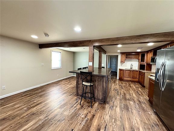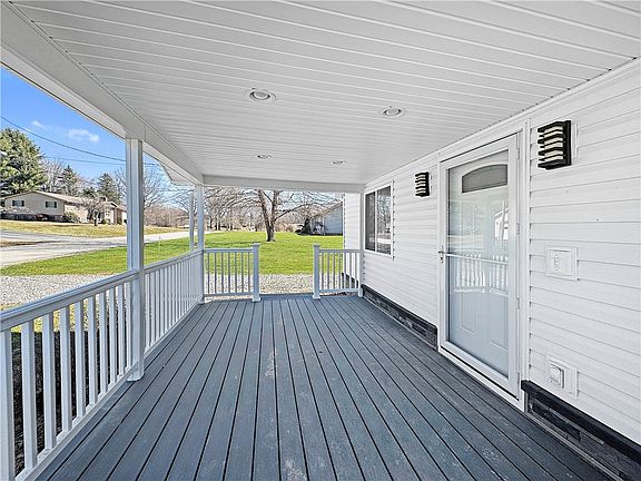 This stunning 1 bedroom bungalow has been completely gutted and remodeled to unparalleled perfection, blending classy yet rustic charm with modern upgrades. Step inside to an inviting open-concept kitchen, dining, and living area, featuring a beautiful beamed ceiling, granite countertops, eat-at center island, and top grade wood-grain laminate flooring throughout. Every detail has been thoughtfully updated including a new roof, windows, siding, furnace, a/c, and stone to grade - ensuring peace of mind and efficiency for years to come. Enjoy outdoor living with a large front porch underscored in durable Trex decking and a coordinating expansive back deck, perfect for relaxing or entertaining. The level yard offers plenty of space and off-street parking adds convenience. Whether you are looking for a cozy retreat, a first home or an investment property, this home is truly move-in ready and sure to please!