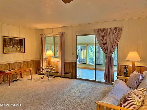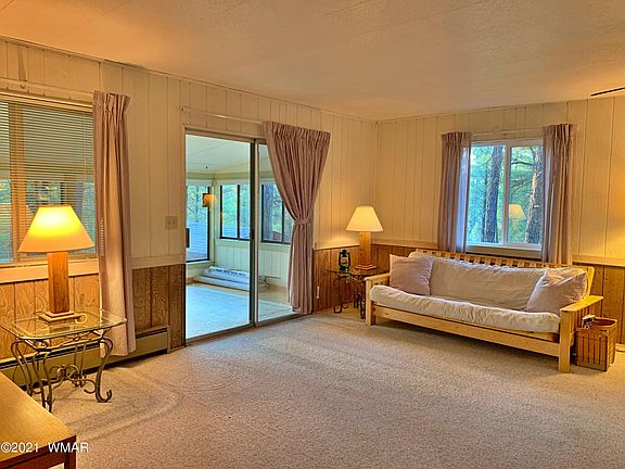 Looking for a cozy retreat in the tall pines, here it is. This 3br/2ba home is perfectly perched atop a ridge looking to the National Forest. Set back with a circular drive and positioned to take advantage of the spectacular views from every window. Enter the home and you are greeted by a cozy dining area and galley kitchen, complete with stainless appliances. The area opens to the living room with lots of space to relax and unwind. To the left are the 2 bedrooms - the master, two guest rooms, and two bathrooms. Through the living area is the large AZ room with sliding dual pane windows with spectacular views of the forest beyond. This area opens to another spacious rear covered deck overlooking the heavily treed, gently sloping lot that's perfect for a summer garden. A must see.