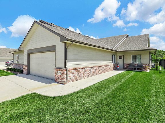 JUST LIKE NEW! Discover this darling 3 BR, 2 BA move-in ready 1/2 duplex, ideally situated in the highly desirable Goddard School District. With its serene lake views and zero entry modern design, this twin home is not only perfect for professionals and empty nesters but also investors. Built in 2023, this residence combines pleasing aesthetics with the ease of low-maintenance living. Luxury vinyl flooring enhances the main living areas, ensuring durability and style. Well-suited for gathering, the open kitchen is a highlight, showcasing pretty quartz countertops, stainless steel appliances, a center island with an eating bar, crisp white cabinets, and a walk-in pantry. The open-concept design flows seamlessly into sun-soaked living spaces, perfect for both relaxation and entertaining. Retreat to a lovely primary suite with stunning lake views and an en-suite bathroom. Enjoy dual sinks, a shower, and a walk-in closet. The thoughtful split-bedroom floor plan enhances privacy, making it ideal for families and empty-nesters alike. Additional highlights include: white trim, ceiling fans, a three-lite sliding patio door leading to a covered patio, a fenced backyard, and a sprinkler system for easy outdoor maintenance. The HOA covers lawn care. Enjoy tasteful charm and promising rental potential in this better-than-new twin home. Don’t miss! Specials have not been fully spread.