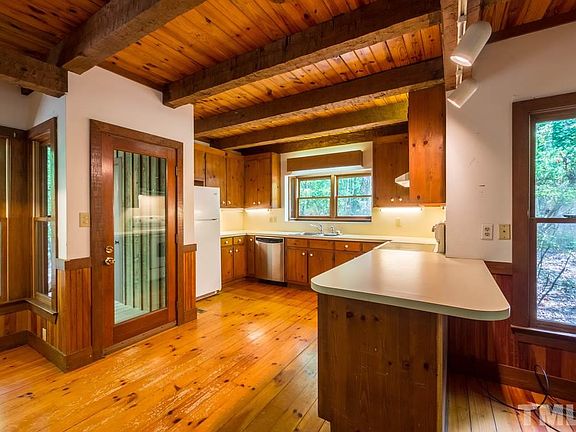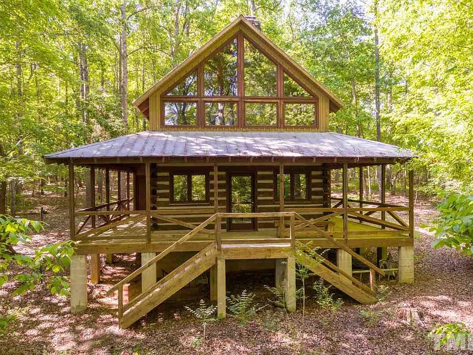Classic cure for cabin fever on 5+ acres. Authentic handcrafted construction, wonderful wraparound porch, great windows, skylights, hand-built stone wood-burning fireplace, eat-in kitchen, 1.5 baths, loft, freshly buffed heart pine floors throughout, new interior paint & exterior stain. Low Chatham County taxes yet close to the action of Chapel Hill, Carrboro, Pittsboro. Improvement permit allows 3 bedrooms, fenced yard, pretty views & privacy. Now is your chance to escape to a cool cabin in the woods.
