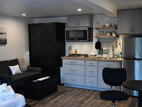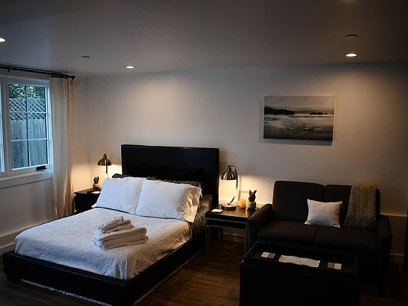 This peaceful and modern studio is located on a half-acre property up a private road in Mission Canyon. It features a full kitchen with stainless steel refrigerator, Kraus kitchen sink, gas stainless steel stove range, and oven/microwave. There is a full-size bed, couch, ottoman/coffee table with storage, armoire/closet, small kitchen table, and a 32" Smart Samsung TV with streaming services. Enjoy your morning coffee or a glass of wine at sunset on your little private brick patio. You are welcome to use the laundry room in the main house once per week. Reserved off-street parking and EV charging available 1 Tenant Maximum. No pets allowed. Flexible leases available (30-day minimum). All utilities and wifi are included. You will have access to the laundry room in the main house once per week.