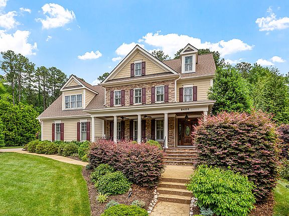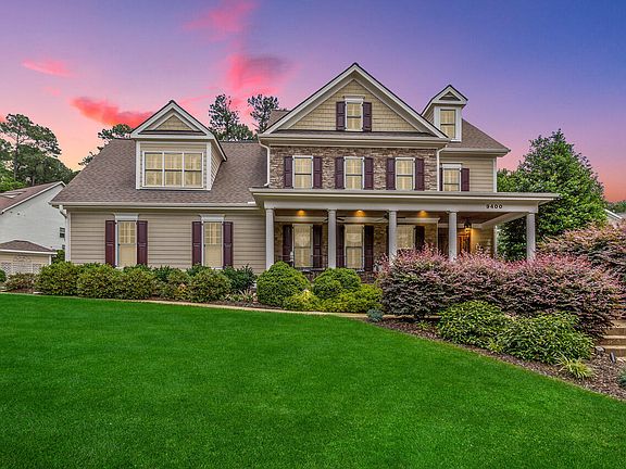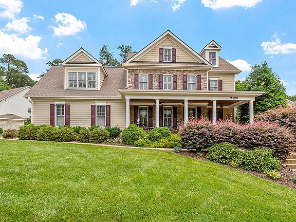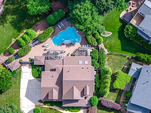 Incredible custom home by Barrington Homes minutes from RTP major employers, great schools, shopping, and fine dining. Hardwood floors, plantation shutters, open flowing floor plan great for entertaining — each floor has built-in speakers + in back courtyard. Central family room with stone-surround gas log fireplace, built-in cabinetry, and open to kitchen & huge breakfast room. Gourmet chef's kitchen with granite countertops, bar front seating, farm sink, center island, commercial style vent hood, 6-burner WOLF gas range with pot filler, Miele SS second wall oven and microwave. Huge walk-in pantry with wine rack fills with natural light. Adjacent home office organization area. Elegant formal dining room with coffered ceiling, transom window, beautiful chandelier, butlers pantry with wine fridge. Your own back yard oasis with salt water in-ground pool with Baja shelf and water fall. Pool cabana with 1/2 bath and outdoor shower. Gas fire pit, shady trellis areas. Outdoor kitchen with bar front seating, stainless sink, refrigerator, ice-maker, Alfresco commercial style gas grill / smoker, and Alfresco VersaPower high BTU burner for wok cooking, crab boils, etc. First floor full guest suite with private bath. Primary suite has large walk-in closet with built-ins and luggage storage nook. Private bath with corner jetted tub, walk-in tile shower, and heat lamp. Each guest suites have their own private full bath. Dream garage / work-shop has epoxy floors, built-in storage cabinetry, ceiling fans, radiant heater, commercial grade scullery sink. Second floor bonus room with rear stair well and hall access has built-in bookshelves and huge closet. Third floor bonus room has cork flooring, cedar lined storage closet, and its own mini-split HVAC system — makes a great media room or gym. Four-season room has skylights, radiant heater, paver floor, and sliding windows to close completely in the winter or open to enjoy the breeze in the spring. Welcoming flag stone covered front porch has ceiling fans and stained bead-board ceiling. So many thoughtful details: whole house Generac natural gas generator starts automatically in power outages, sealed & conditioned crawl space, humidifier, new tankless water heater, professional landscaping and hardscaping, and French drains.