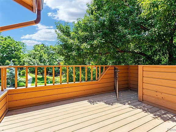 Move-in ready Penthouse condominium, 1 Bedroom, 1 Bath plus Den. South-facing end unit allows natural light from the east, west, and south and has a large skylight in the bathroom. The open floor plan includes a large kitchen and dining area with vaulted ceilings and wood beam. Living room features floor to ceiling brick wood-burning fireplace and built-in bookcase. The kitchen area has an island with raised eat-at bar. Granite countertops with tumbled marble backsplash. All cabinet bottoms and drawers have been fully lined. Den has French doors with glass panes. The den could be used as TV or guest room. Bathroom has a large skylight , jetted bathtub, rainfall showerhead, and shower/tub is beautifully tiled and also features granite countertops. Spacious bedroom includes two large, bi-pass door closets. The hallway has a coat closet, mini-walk-in closet, and a double-door laundry area with separate Maytag washer and dryer. Graber wood blinds throughout the unit, new carpet, new 4 1/4" tall baseboard, and all ceiling popcorn has been professionally removed. The unit has an oversized tree-top level deck with a great view and a mature shade tree. 1 car attached garage has a storage area and side entry/exit door. Located in a beautifully landscaped, park-like community bordered by the Highline Canal and Cherry Creek Country Club.