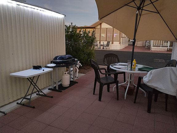 Bonita Mesa, Site 112 1999 Chariot Eagle w/additional add-on This is a very nice park model with a commercially constructed southwestern style addition doubling the original footprint, sitting on a spacious corner lot with an oversized carport (15 ½ X 20) and concrete drive. There are two (2) bedrooms, one bath with large shower, kitchen with new full size LG refrigerator; full size electric range and oven; dish washer; new Moen goose neck pulldown faucet; garbage disposal; newer microwave and new ceiling lighting panels. Off of the eat-in kitchen is the dining area with convenient storage. There are two (2) closets in the hall and the hall also provides access to the bathroom and one bedroom. The second bedroom is located off of the living room and separated by a sliding pocket door. For convenience, there is a new programmable Honeywell thermostat that controls the heating and cooling of the heat pump. Another cost saving feature and convenience is the full size electric clothes dryer. There is a front and back door for convenience and safety. There are five (5) ceiling fan/lights. The front door has a beautiful leaded glass design and has a new storm door with adjustable glass/screen and locking hardware. The front and back doors have smart light switches for the outside lights that can be turned off or on with your cell phone or manually. All outside areas are either concrete or concrete pavers. There is no gravel. There is a patio area behind the house that has a privacy fence and is shaded by mature trees. In addition there is an equipped shed/workshop with lighting and electrical outlets. Interior furnishings are included in the sale price. Priced to sell: $38,000. There will be an option for the purchaser to buy, at a discounted price, our 2021 EZGO golf cart in new condition with add-ons.