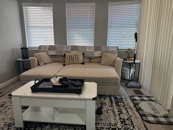 Living room - all new paint, custom blinds, chase lounge sofa, with storage compartment, new ceiling fan, coffee table and end tables, custom rug, smart TV.