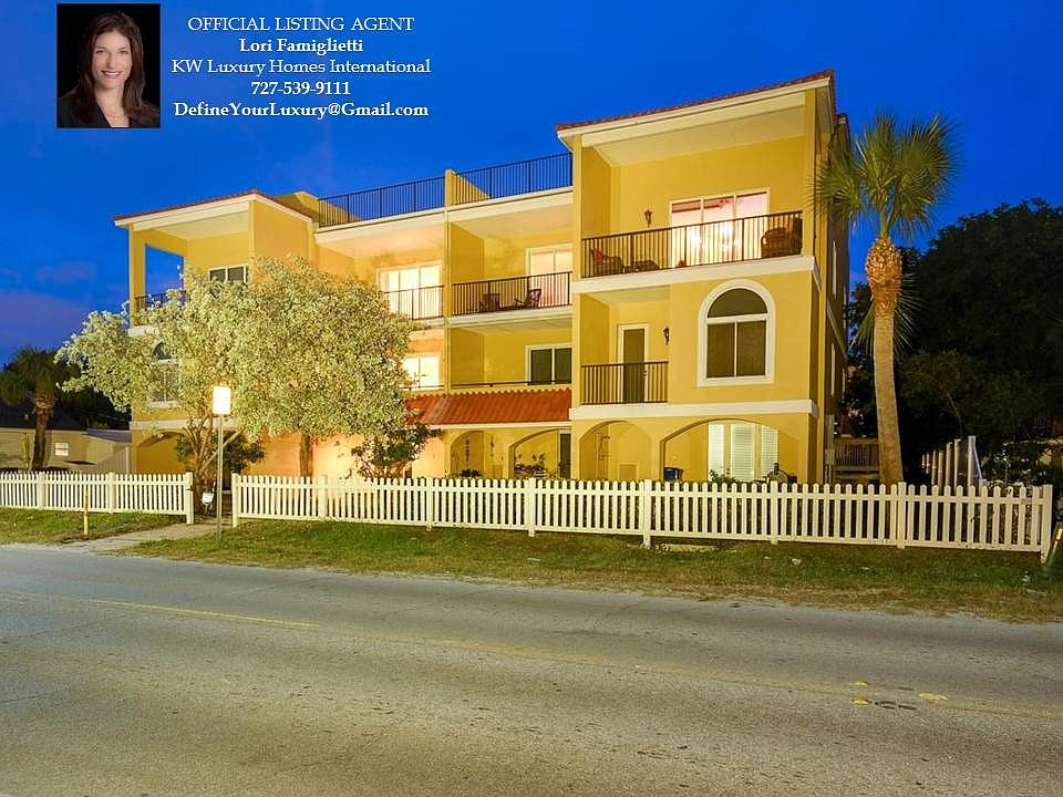 Exceptional, concrete block condo in rare 4 unit building with massive roof top deck with Western Gulf View Views, 2 huge water view balconies, ground floor patio, tandem oversized 3 car garage and private elevator. Unique 2006 Mediterranean 4-level custom home design with living room, and kitchen on the top living floor to maximize water views. Three en suite bedrooms with walk in closets and the huge water view master has double closets, Jacuzzi tub, oversized walk in shower and separate water closet. Walk across the street to the Gulf of Mexico beach access. Sunset Beach is a hidden gem tucked away between St. Pete Beach and Treasure Island, with waterfront restaurants and cocktail spots within blocks. The beach is pretty and reminiscent of the beaches of yesteryear with old pines and privacy. This building is self managed by the four unit owners which keeps expenses low. The unit has two brand new Central AC units, with a transferable warranty. The building has a new roof in 2015 and new paint in 2014 with 10 year warranty. The current owners have gently used the condo for vacation only several weeks a year since 2008. The roof top deck harnesses 360 degree views of the entire area! Flexible rental policy and pet friendly within guidelines. Conveniently located to all coastal activities, yet still 30 minutes to Tampa International Airport. There is nothing quite like this building in the area, and certainly nothing on the market that resembles this unit. Quick close possible to get you in for season!
