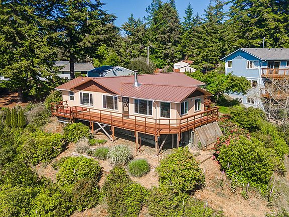 Price reduced, motivated seller! Call your agent today to see this truly special property. Bay front lot & home with a Picture Perfect view of the bay, the bridge, and city lights. This charming 2bd, 2ba, on just over half acre, sits in a quiet, friendly neighborhood off of East Bay Rd. A community easement provides a private access path to a sandy bay beach, perfect to launch kayaks, or enjoy the abundant wildlife of the bay and shoreline. Located on the edge of a cove that provides wind protection. Deck has a place for built in Hot tub (current unit is not working). For cooler days, the large windows bring the view inside. The Primary bedroom and bath are light and bright, the kitchen is a comfortable size, and the home has beautiful newer wood flooring throughout. Furnace new in 2022, Metal roof about 10-15 years old. Outdoors, you'll find garden space and flowering and native plants making the property even more delightful. A greenhouse along side of home provides storage and a protected area for outdoor hobbies. RV parking. Oregon's Southcoast is your playground with easy access to the beach, dunes, or town. Buyer due diligence for short term rental opportunity. Don't let this opportunity pass by. Welcome home!