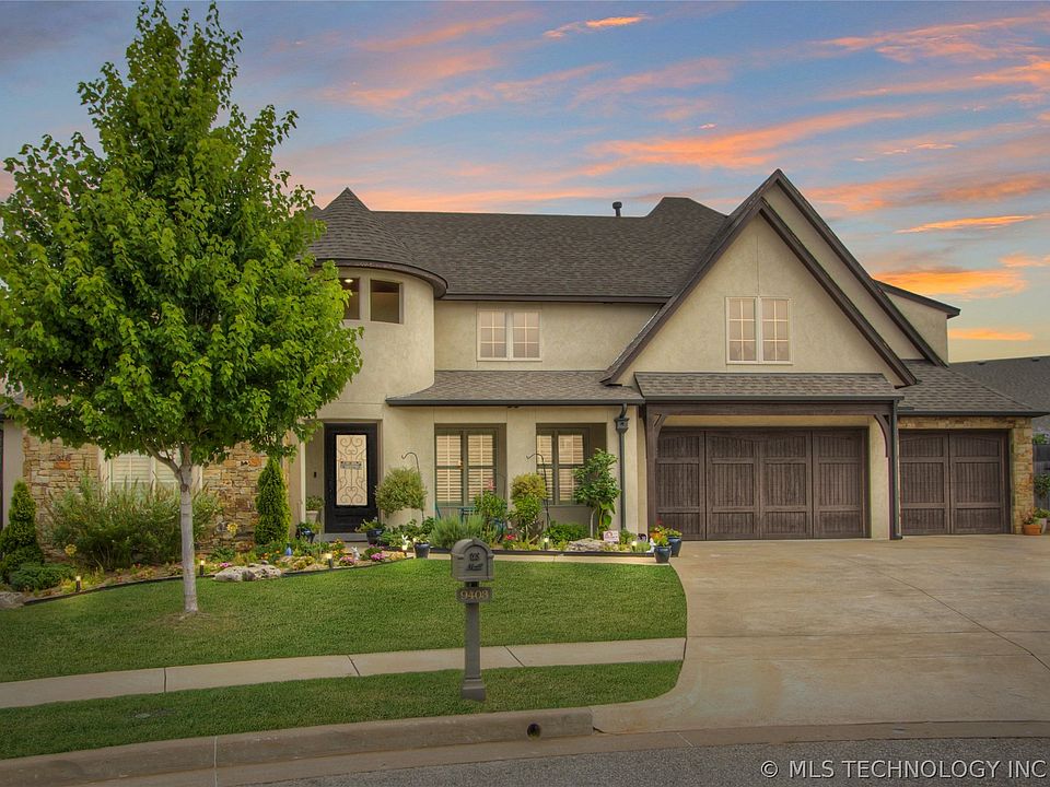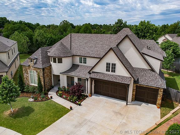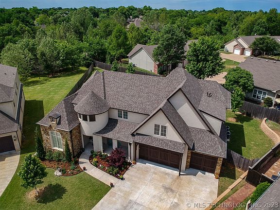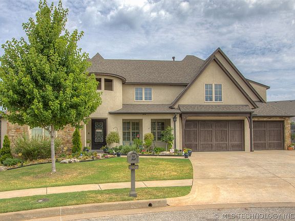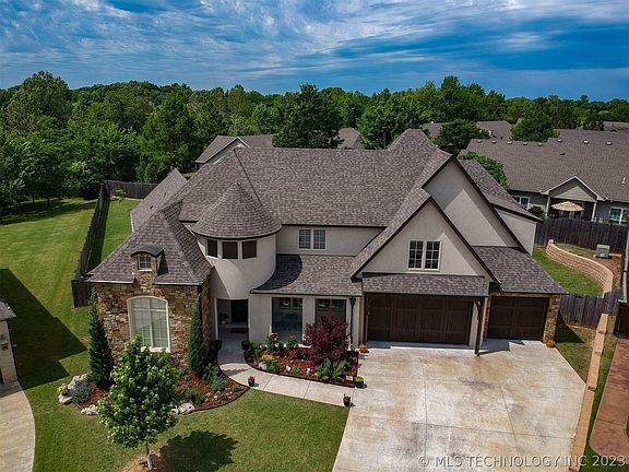 Beautiful home in The Legends with Greenbelt view & oversized lot with plenty of room for a pool. "Like New" construction with primary suite and separate guest suite downstairs. Detailed finishes & fixtures, grand entrance and vaulted ceilings. Large game room upstairs with 3 beds and 2 full baths. Gorgeous extended, stained patio with firepit. Upgrades include a new circulating pump for instant hot water, new Thermador 8 burner cooktop, new dishwasher, new soft close garage doors, new sump pump, and new whole home water filtration system. Neighborhood pool, playground and stocked fishing pond. Bixby Schools!