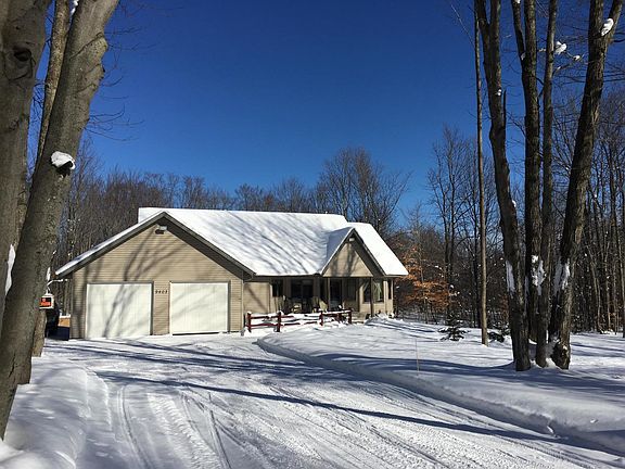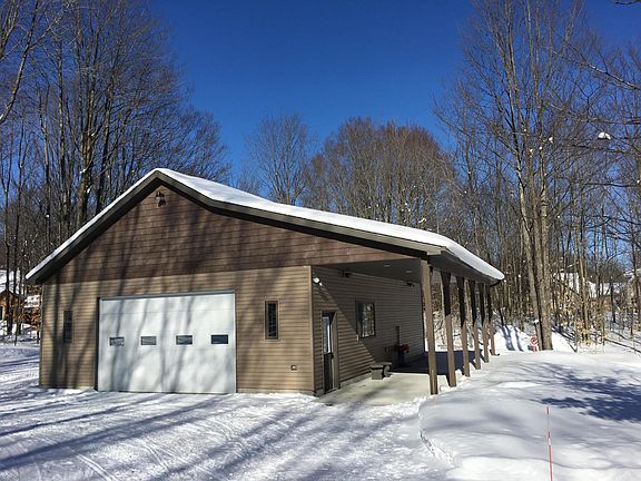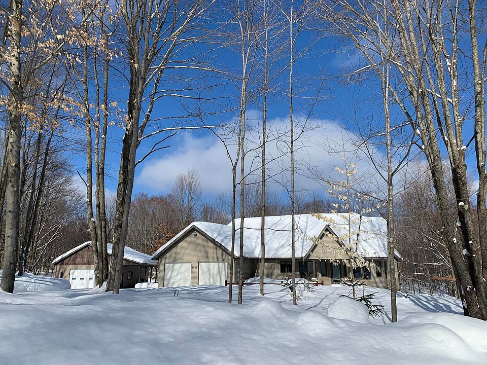 SNOWMOBILERS AND GOLFERS this 4 bedroom home with finished walk-out lower level is perfect for you. Vaulted ceilings, custom stone gas fireplace in living room, hardwood floors and French doors in formal dining room. Spacious eat-in kitchen boasts of hickory cabinetry, tile floors and newer appliances. Main floor master suite with door to deck and hot tub. Walkout lower level has knotty pine and 1/2 log walls, pellet stove with hearth, custom tile floors, custom pine bar, kitchenette, wood laminate floor in rec room. 4th bedroom with 1/2 bath and sauna. Home is situated on 3 professionally landscaped lots with irrigation, field stone accents and a unbelievable 30 x 40 man-shed with overhang, in floor heating, 1/2 bath, water and 9ft. front and rear overhead doors, This is a Must See!
