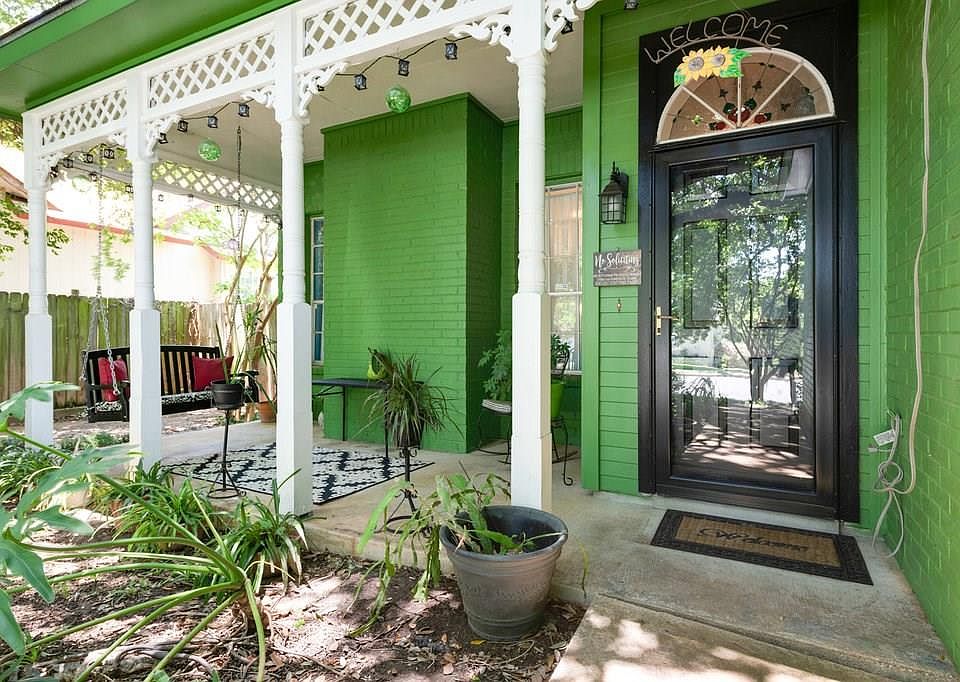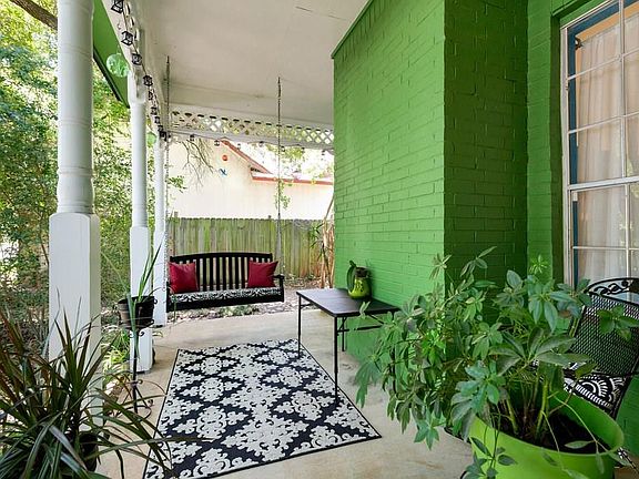 Adorable bohemian chic So Austin home w/tons of personality. No boring color schemes here. Oversized rooms w/20' ceilings in the living areas. Open plan. Enjoy your very own peaceful master retreat w/a spacious master bedroom & bath. Awesome curved wall lined with windows in master overlooks the very private back yard. All other beds and bath are located at the front of the home & provide the ultimate in personal space. Indoor laundry. Cozy front porch swing conveys!