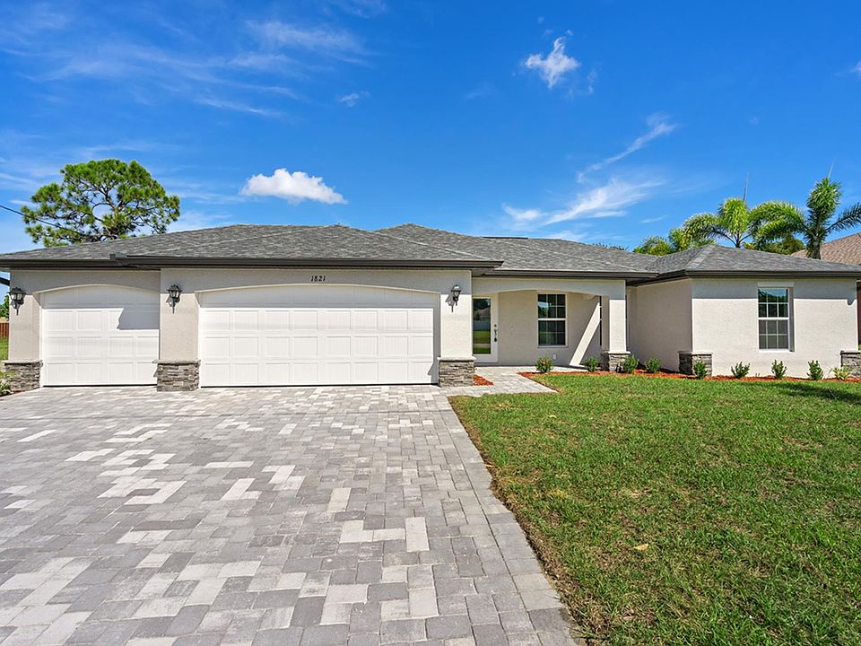 Grand Pineland floor plan. Beautiful 3 bedroom home with 3-Car garage. Home includes a 1 yr warranty and a 10 year structural warranty! Open floor plan with 9'4" ceilings and 10' Trays. Also featuring a center island kitchen and 8 foot doors throughout. Spacious living room leads to large covered lanai to enjoy the SW Florida lifestyle! Features Include: Concrete Block Construction and Wood Frame Interior, Under Truss Lanai, Lenox 14 Seer high efficiency AC system, Moen plumbing fixtures, Dimensional Shingles, PGT Low E Insulated windows, cabinets with soft close doors, Granite Counters in Kitchen and Bathrooms, Stainless Steel Kitchen appliance package, colonial style raised panel doors, Electric garage door opener, 18" tile flooring in main living areas , Stone Accents on front elevation of the home, irrigation system, epoxy coated garage floors. Pictures shown are of a completed home and features may differ. You will not find another new construction home at this price with this quality of construction!