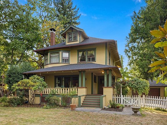 Classic PDX style home full of historic character. This 1910 gem exudes timeless charm. Surrounded by the lush canopy of beautiful trees, this property offers a serene and private oasis within the city. A standout feature is the oversized two-car garage, a rare find in historic homes. Including a nostalgic front porch, french doors, pocket doors, bay windows, and a foyer. Walk outside on to the incredible .58-acre lot with a variety of fruit and nut trees. This historic Portland home, with its blend of history and contemporary living, is a rare opportunity. The zoning also allows for an ADU or lot partition for a second home or multifamily property. Buyer to complete there own due diligence for development opportunities.