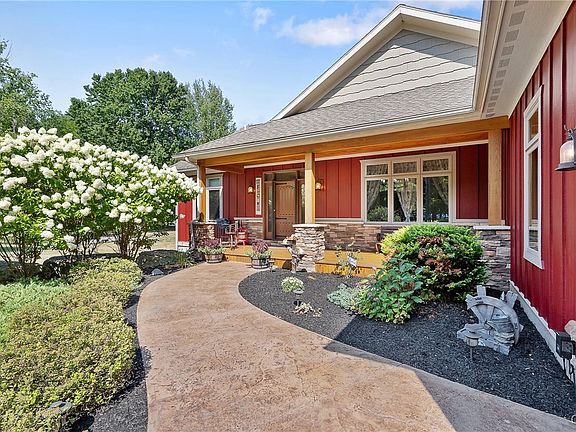 Welcome to 9406 Bear Springs Road, a stunning 4,864 sq. ft. custom-built ranch crafted in 2015, offering the perfect blend of rustic elegance and modern comfort. This open-concept masterpiece features dramatic vaulted ceilings, rich woodwork, barnwood accents, and elegant crown molding, creating a warm yet sophisticated atmosphere throughout. The gourmet kitchen is a chef’s dream with abundant cabinetry, granite countertops, a spacious walk-in pantry, and a seamless flow into the living area, anchored by a central stone-hearth gas fireplace. Oversized windows and an 8' sliding glass door with transom bathe the home in natural light, while custom barn doors add distinctive charm. The finished walkout lower level expands your living space with a gas fireplace, luxury vinyl flooring, a full bath, and versatile areas perfect for a bar, home theater, gym, or office. Outdoors, enjoy professionally landscaped grounds, a stained front porch with stone and wood detailing, and a stamped concrete patio featuring a full outdoor kitchen with natural gas grill and running water—ideal for entertaining. A detached 36’x56’ insulated pole barn with gas, electric, and water offers endless possibilities, from a workshop or car collection to a potential in-law suite. Additional highlights include a whole-house generator, walking trails, hunting opportunities, and an attached 2-car garage with fresh finishes and epoxy flooring. Public water, natural gas, and thoughtful updates inside and out ensure comfort and convenience year-round. This property is more than a home—it’s a private sanctuary designed for exceptional living.