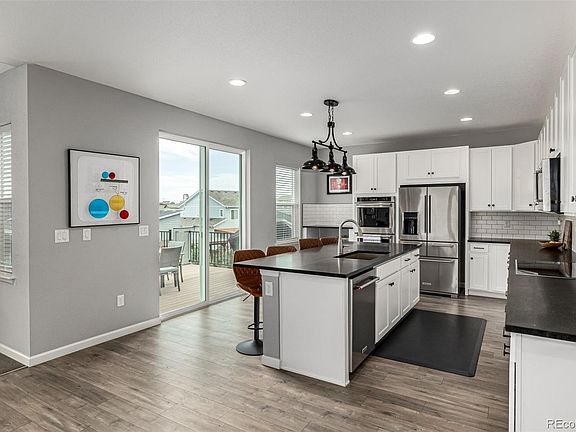 Perfect in every way! Tucked at the end of a quiet cul-de-sac in the sought-after Candelas Community, this beautiful two-story home masterfully blends sophistication, functionality, and Colorado charm. A lush front lawn sets the tone, framing the 3-car garage and welcoming curb appeal with undeniable warmth. The fabulous interior showcases vaulted ceilings, abundant natural light, a neutral palette, recessed lighting, and tasteful flooring - carpet & wood-look tile in all the right places. The spacious open layout will surely impress you! The gourmet kitchen is a true centerpiece, showcasing high-end SS appliances, black honed granite counters, a subway tile backsplash, white shaker cabinetry, and a prep island with a breakfast bar. Just off the front entry is a French-door den offers flexible use as a home office or creative space! Additionally, there is a mud room with a closet. All bedrooms await upstairs! The primary suite has a lavish bathroom with dual granite sinks, a soaking tub, a glass-enclosed shower, and a walk-in closet. Two secondary bedrooms share a Jack & Jill bathroom. A major highlight of the home is the walk-out basement, a rare and valuable find! Thoughtfully divided into two large rooms, this versatile space offers endless possibilities: think family room, game room, fitness studio, or multi-generational setup. Out back, unwind or entertain across multiple zones! From the elevated deck to the shaded covered patio below and the open patio beyond, complemented by low-maintenance artificial turf that keeps the landscape vibrant year-round. Living in Candelas means enjoying over 13 miles of trails, 93 acres of open space, and direct access to over 11,500 acres of protected public lands! A nearby National Wildlife Refuge provides a sanctuary for deer, elk, owls, and white pelicans. Minutes from a vibrant mix of shopping, dining, & entertainment. What's not to like? See it! Love it! Live it!