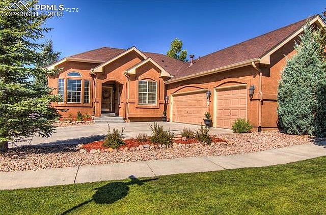 This immaculate rancher is located in the desired D20 on a corner lot in a cul-de-sac w/quick access to N Powers Corridor and I-25. The exterior of the home definitely doesn't lack curb appeal w/the gorgeous landscaping, oversized 3 car garage and oversized driveway. The light and bright open floor plan offers main level living! The gourmet kitchen features granite counters, double oven, stainless steel appliances and counter bar. In the formal dining room is a brick accented double sided fireplace that it shares w/the family room. The master features a walk-out, huge walk-in closet and a 5pc master bath that includes french doors, jetted tub and separate vanities. The main level also includes an additional bed w/walk-in closet and bath. The finished basement has 9 ft ceilings, huge rec area with bar a full sized wet w/pantry, wine rack, sink and teardrop lighting. Two more beds w/walk-in closets and bath w/separate vanities can also be found in the basement. In the spacious backyard is a professionally installed invisible fence, but the best part is enjoying the Pikes Peak views and mature trees on the TREX deck or the patio. There will never be a dull day being part of the Wolf Ranch community definitely has its perks! Visit the community events, pool, parks and trails!