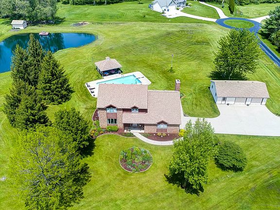WOW! Take a look at this meticulously maintained 4 acre property in Leo! This fantastic property features a heated 20'x40' concrete pool with diving board and automatic cover, a stocked pond, a 2 car attached garage as well as a 2nd detached garage with a heated workshop, and a 3500+ sq ft home. The 4 bedroom 2.5 bath home boasts a separate living/family room, a brick fireplace (gas log) in the family room, a formal dining room, an eat-in kitchen with an abundance of Harlan cabinets & quartz counters, a reverse osmosis system, large bedrooms, 6 panel doors, a partially finished basement with a huge storage room, and many recent updates. Recent updates include a newer water heater, kitchen, roof, pool cover, pool filter, paint, carpet, furnace, AC unit, well tank, sump pump, and garage door opener. A full list of updates is available upon request. Outside you will find a large gazebo next to the pool, a concrete drive with a basketball goal, a storage shed, a garden, several mature trees, beautiful flower beds, and a covered front porch. This home has been loved by the same owners for the past 28 years. You will be hard pressed to find a more well cared for home than this one, so schedule your showing today!