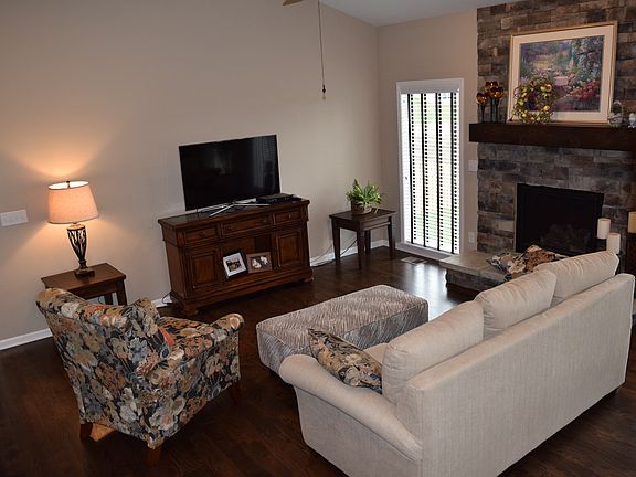 Barely lived in Ranch floor plan with extra upgrades. Open concept main level has upgraded kitchen cabinets, hardwood floors in the livingroom and kitchen, granite counters, lg center island, pantry. 3 bedrooms on the main level. Master suite bathroom has been enlarged from the standard plan, walk-in closet. Lower level offers an additional bedroom & full bath, bar area and a workshop. Lg storage area. Walkout on the main level to a covered deck or from the basement to a patio. Enjoy the green spaced yard.