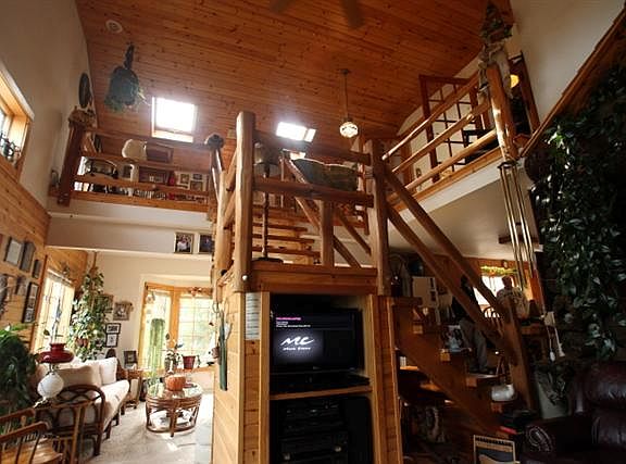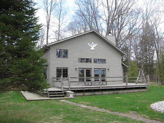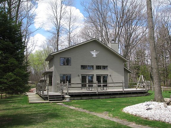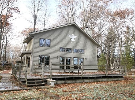 This home is beyond compare. The very unique center point is an authentic log cabin, which serves as the gathering & dining area for all family events. In 1939 this log cabin made a 5-mile journey along gravel roads and frozen lake surface, making its home on this lake site. Built around this log cabin (most recent expansion in 1990) , is an entire residence that beautifully resonates the cabin and its historic elements. Currently laid out as a 2-bedroom home, there are possibilities for additional creative layout. 2 full baths (one on each level), a spacious loft, a 1st floor laundry room, very generous storage capacity including a roomy kitchen pantry, an office nook area, a room-like walk-in closet off the Master Bedroom, all these items impart convenient lifestyle. To capture the beauty of lake living, the home has: the beautiful warmth of pine elements, a wonderful wood-burning stove surrounded with a striking wood log mantle & raised hearth; double-French doors that open to a wrap-around deck; thoughtful window placement provides amazing views of lake and nature; and there is a cozy 2nd level porch deck off the Master Bedroom area, where you can enjoy the view with a good book, though you may find yourself doing more gazing than reading. A vast 4-car detached garage (along with a very large basement level), mean endless storage possibilities!! But let's not forget the most profound element; lake living with a shore that offers private, secluded beauty on a most lovely lake...
