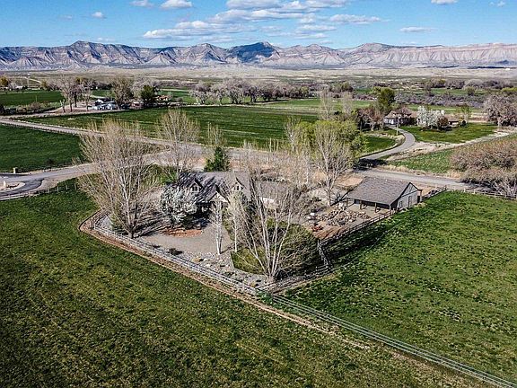 Amazing opportunity to own a gorgeous home and horse property situated on 6.4 acres just minutes north of Grand Junction. This custom home has had just one owner and features southwest-style log and stone details that create a warm and inviting space. Home offers 3 bedrooms (plus an office/sitting room), 3 bathrooms, formal dining room, breakfast nook and a spacious master suite. 2023 updates include a remodeled kitchen, new carpet, refinished hardwood floors, new bathroom vanities and a freshly stained deck. In addition to the attached 2-car garage, there is also a detached 2-car garage with a tack room, horse stalls and storage space. Enjoy riding in the corral or through the lush fields surrounding the property.