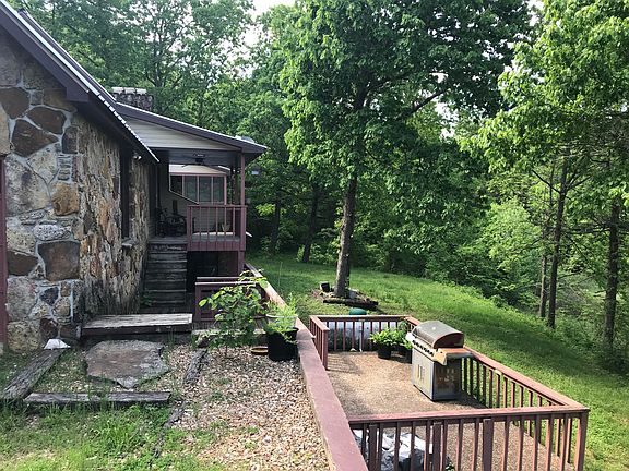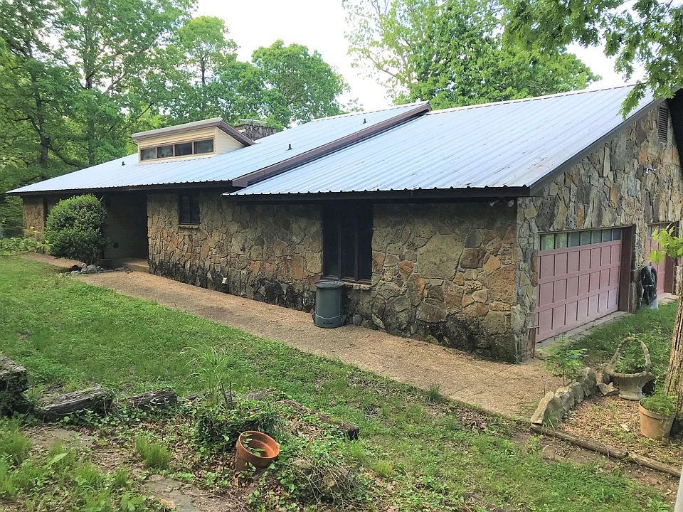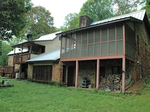 PRIVATE year round creek and waterfall on the edge of town with 12+ Acres and a 4 BR, 2.5 BA, 3 Car garage, 2 rock fireplaces, covered deck, covered screened in porch, stone and vinyl house with a metal roof, backup generator, and much more. Plus a 36'x60 shop with 220 electric. Needs some TLC.