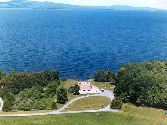 Outstanding Lake Champlain & Adirondack views with the occasional Bald Eagle sighting! Very private waterfront location sitting up on a bluff. End of private road with nearby access to the private association beach with dock. Terrific flat open fenced lawns with the Lake & Adirondacks as your backdrop- Great for outdoor entertaining! Vaulted living room features pastoral views east toward Green Mountains & an impressive 2-story stone fireplace. Step-up to the open kitchen/dining with deck access & expansive views toward the lake. 3 bedroom wing with full bath. 2nd story master suite with fireplace, vaulted ceiling, 3/4 bath, adjoining office & balcony all facing the lake. Finished lower level with walk-up to garage, & lots of unfinished storage space. Attached 2-car garage & additional attic storage. Member of Hills Point Association. Assessor's Card notes 2,462 SF.
