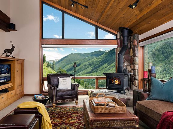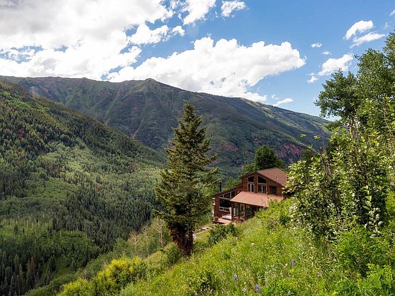 A charming home, meticulously cared for, that sees nothing but mountains and sky and hears only the sound of Castle Creek rushing below. Ideal property for those looking for a mountain retreat with privacy, quiet and majestic panoramas, but not isolated & within minutes of Aspen's civilization. Perched on a hillside and bordered on its long south side by Nat'l Forest Service land, this 2-acre slice of heaven has stunning views up and down the Castle Creek valley. Renovated w/ a new addition in '02, w/ numerous upgrades since: 2 master suites, wood stove, hot tub, generous deck for outdoor dining, and small yard. Located on back side of Aspen Mtn - snowmobile to Sundeck/ski down to gondola. Also enjoy hiking, mtn biking, jeeping, x-c skiing from front door. 9 mi to Aspen. Relax and renew -