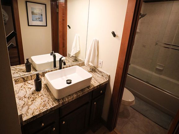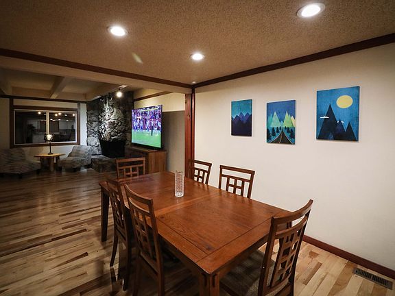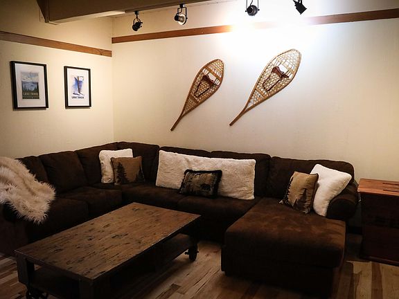 We are looking for a great family to enjoy our lovely 1,750 square foot condo in North Lake Tahoe. This fully furnished, turn-key townhouse has wood floors throughout and is nestled above a babbling creek adjacent to the National Forest. The mountain and creek views are absolutely spectacular! The main level boasts an open floor plan that includes a brand new, fully remodeled kitchen as well as a breakfast bar, living room with gas fireplace, half-bathroom and dining room. The living area has a HUGE 82" flat screen smart TV, great for movies and football alike. Off the living room, sliding doors open onto the spacious patio, which has a gas-powered fire table, grill, and an infrared sauna for your apres ski enjoyment!
