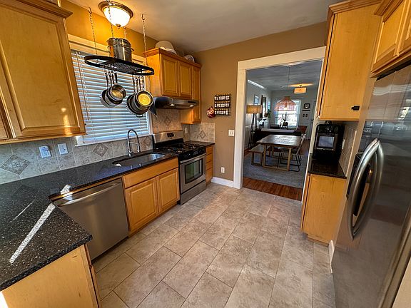 Bright, updated kitchen with granite countertops, gas range, stainless steel appliances, and new tile flooring.