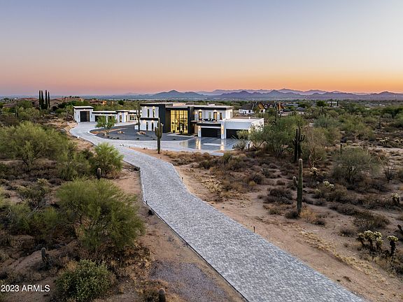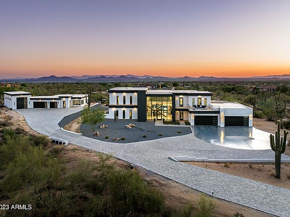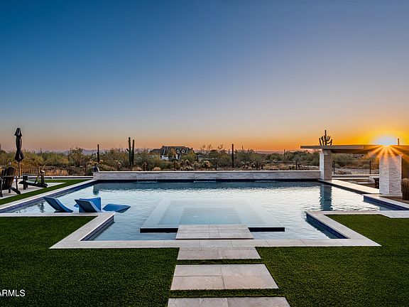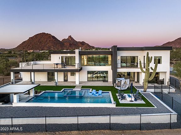 NESTLED WITHIN THE SERENE EMBRACE OF AN EXPANSIVE 4-ACRE + ESTATE, THIS NEWLY CONSTRUCTED MARVEL STANDS AS A TESTAMENT TO CONTEMPORARY ARCHITECTURAL OPULENCE, OFFERING A BREATHTAKING 360-DEGREE PANORAMA THAT UNFOLDS FROM EVERY CORNER OF ITS PRISTINE GROUNDS. A JOURNEY OF LUXURY COMMENCES AS YOU TRAVERSE A WINDING PAVER DRIVEWAY THAT LEADS TO THE AWE-INSPIRING CUSTOM GLASS DOOR ENTRY, A PORTAL TO ELEGANCE BEYOND COMPARE. THE ENTIRE FRONT FACADE IS AN ASTONISHING GLASS CANVAS, BATHING THE GRAND FOYER IN A CASCADE OF NATURAL LIGHT. THE FOYER'S SPLENDOR IS FURTHER ELEVATED BY A CUSTOM STEEL AND WOOD STAIRCASE, AN EXQUISITE WORK OF ART THAT GUIDES YOU TO THE HEART OF THIS LUXURIOUS HOME. HERE, IN THE EXPANSIVE FAMILY ROOM, A METICULOUSLY DESIGNED GLASS-ENCLOSED WINE ROOM BECKONS CONNOISSEURS TO SAVOR THE FINEST VINTAGES. A CUSTOM FIREPLACE GRACES THIS SPACE, WHERE SLIDING GLASS DOORS SEAMLESSLY TRANSITION TO THE OUTDOORS. A COZY SEATING AREA, FRAMED BY THESE PICTURESQUE DOORS, INVITES MOMENTS OF REPRIEVE WHILE OFFERING CAPTIVATING VIEWS OF THE METICULOUSLY LANDSCAPED BACKYARD AND THE DESERT'S CAPTIVATING VISTAS. THE CHEF'S KITCHEN IS A SYMPHONY OF MODERN ELEGANCE, BOASTING SLEEK CABINETRY, TOP-OF-THE-LINE APPLIANCES, AND A SPECTACULAR WATERFALL ISLAND, ADORNED WITH CUSTOM CONTEMPORARY LIGHTING AND BAR SEATING FOR GATHERINGS. A SIX-BURNER GAS RANGE, DISCREETLY CONCEALED OVERSIZED REFRIGERATOR, AND AN INTEGRATED COFFEE MAKER ENHANCE THE CULINARY EXPERIENCE, WHILE GLASS CABINETS SHOWCASE YOUR MOST CHERISHED KITCHEN TREASURES WITH GRACE. CONTINUING THE HARMONIOUS FLOW, THE KITCHEN EFFORTLESSLY TRANSITIONS INTO THE DINING AREA, WHERE OPULENT DINNERS TRANSFORM INTO CHERISHED MEMORIES. AN ELEGANT POWDER ROOM, FINISHED WITH IMPECCABLE ATTENTION TO DETAIL, AWAITS THE ARRIVAL OF ESTEEMED GUESTS. THIS REMARKABLE RESIDENCE INDULGES IN TWO MASTER SUITES, EACH OFFERING ITS UNIQUE ALLURE. THE DOWNSTAIRS SUITE IS A SPACIOUS SANCTUARY, BATHED IN NATURAL LIGHT TO ENJOY MESMERIZING VIEWS. ITS OPULENT BATHROOM AND CUSTOM CLOSET WITH BUILT-INS AND DISCREET IN-CLOSET WASHER AND DRYER EXUDE SOPHISTICATION AND CONVENIENCE. UPSTAIRS, THE SECOND MASTER SUITE, FEATURING A FIREPLACE AND A PRIVATE BALCONY, BECKONS WITH AWE-INSPIRING VIEWS OF PINNACLE PEAK. AN ADJACENT LOFT AREA PROMISES TRANQUIL MOMENTS OF RELAXATION. ADDITIONAL GUEST ROOMS, EACH BOASTING EN-SUITE BATHS, PROVIDE LUXURIOUS ACCOMMODATIONS FOR ALL YOUR GUESTS. FOR THE ULTIMATE ENTERTAINMENT EXPERIENCE, AN ELEGANT MOVIE THEATER ROOM IS READY TO TRANSPORT YOU TO CINEMATIC REALMS. CAR ENTHUSIASTS WILL REVEL IN THE SEPARATE 12-CAR GARAGE AND RV GARAGE, OFFERING SECURE HAVENS FOR YOUR CHERISHED VEHICLES. THIS IS A SANCTUARY WHERE YOUR PRIZED AUTOMOBILES FIND THEIR RIGHTFUL PLACE, WHERE THEY ARE NOT JUST STORED BUT ELEVATED TO THE STATUS OF REVERED TREASURES, A TESTAMENT TO THE ULTIMATE IN AUTOMOTIVE LUXURY. ADDITIONALLY, A DETACHED GUEST HOME SPANNING 1,666 SQUARE FEET BECKONS WITH A KITCHENETTE, A WELCOMING LIVING ROOM, AND A GLASS ENTRY DOOR THAT MIRROR THE SOPHISTICATION OF THE MAIN RESIDENCE. THE GUEST HOME EXTENDS ITS LUXURY WITH A PRIVATE HOME GYM AND A GOLF SIMULATOR ROOM, ENSURING A COMPLETE OASIS FOR GUESTS. VENTURING INTO THE BACKYARD, YOU'LL DISCOVER A CONTEMPORARY HAVEN OF OUTDOOR EXTRAVAGANCE. THE SLEEK, CONTEMPORARY POOL BOASTS A SEAMLESS SPA AT ITS ENTRANCE, WHILE A BAJA SHELF WELCOMES SUNBATHERS TO BASK IN THE SUN. THE TRANQUIL AMBIANCE IS HEIGHTENED BY THE GENTLE SYMPHONY OF WATERFALL WATER FEATURES. AN EXPANSIVE SYNTHETIC GRASS AREA OFFERS THE PERFECT CANVAS FOR OUTDOOR ACTIVITIES, WHILE A BUILT-IN FIREPIT SEATING AREA BECKONS BENEATH THE STARLIT DESERT SKIES. THE CROWNING JEWEL OF THE OUTDOOR OASIS IS THE SWIM-UP POOL BAR, WHERE RELAXATION MEETS INDULGENCE. ADJACENT, A SUNKEN BAR AND KITCHEN AREA, COMPLETE WITH A BUILT-IN GRILL, PROVIDE AN EXQUISITE SETTING FOR OUTDOOR ENTERTAINING. FRAMED BY VIEW FENCING, THE BACKYARD OFFERS UNRIVALED VISTAS OF CITY LIGHTS AND MAJESTIC MOUNTAIN VIEWS. THIS CUSTOM HOME IS A MASTERPIECE, AN ODE TO LUXURY LIVING WHERE EVERY DETAIL HAS BEEN METICULOUSLY CRAFTED TO PROVIDE AN EXCEPTIONAL EXPERIENCE. IT'S NOT JUST A HOME, IT'S AN INVITATION TO IMMERSE YOURSELF IN THE PINNACLE OF FINE LIVING.