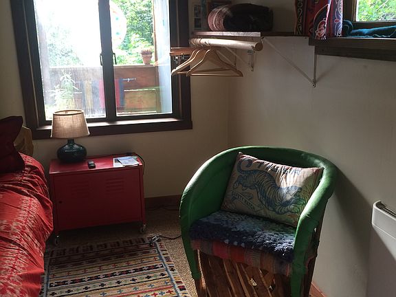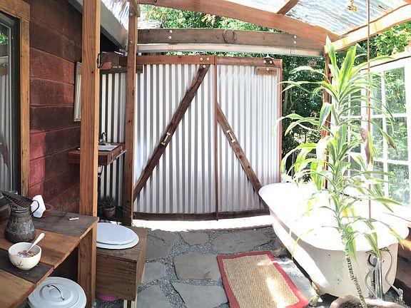 The studio is unfurnished and features a two-burner stove, counter and mini fridge. An attached private outdoor bathroom includes a bathtub, shower, and composting toilet. A shared deck separates the studio from the main house, providing both privacy and connection to the natural surroundings.