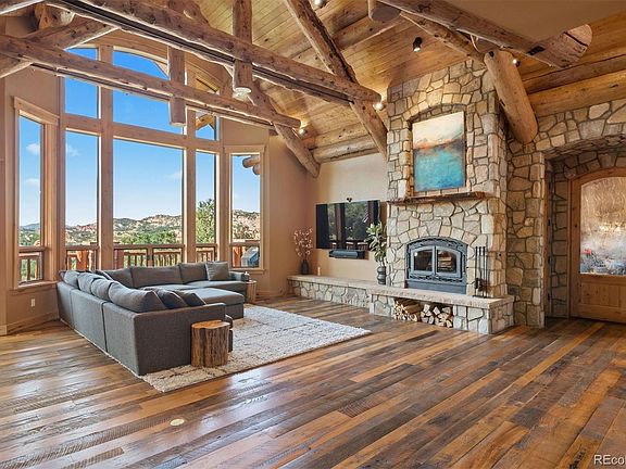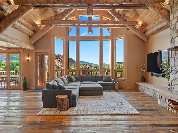 - Description: Soaring Ceilings Feature Log Beam Construction. A Wall Of Windows Frames The Red Rock View And A Stacked Stone Wood-Burning Fireplace Anchors The Space.