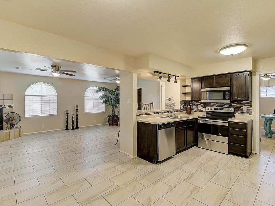 Beautiful home in the community of Saguaro Desert. Home is 3 bedrooms plus a den/ office space and has a very open functional design. Bright and open eat in kitchen adjoins living room and family room and has a breakfast bar, new stainless appliances and LED light fixtures. New tile in all the common areas, new carpet in bedrooms, fresh paint inside and out. Backyard is very open and has a gazebo and two separate covered patios plus a storage shed. New roof, two car garage and RV gate perfect for storage or your toys. No HOA. Close to schools, shopping, parks and the 202 loop. Don't miss this beautiful home!