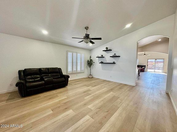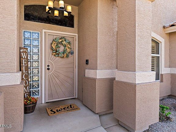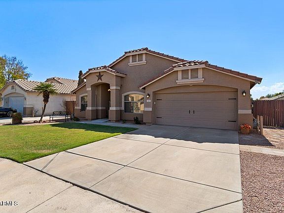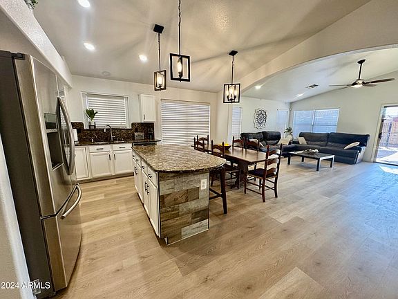 Back on market after getting a super cute remodel! Fantastic single story home located in highly desirable Mesquite Canyon featuring 4 bedrooms, 2 baths, 2 car garage, Through the front door you are welcomed by BRAND NEW vinyl plank flooring throughout, FRESHLY painted white interior which is a blank canvas to decorate to your hearts content, NEW baseboards, additional puck lighting added to give the home that light, bright and airy feeling, living room/dining room combo, kitchen boasts granite countertops and backsplash, stainless steel appliances, white cabs, dining area, kitchen island, flat top electric stove with above b-i microwave, huge walk-in pantry, family room with shiplap accent wall, large primary bedroom with double door entry, walk-in closet and exterior access to backyard , ensuite with dual sinks, separate shower & tub, chevron accent wall with updated mirrors and light fixtures, enjoy outdoor entertaining with sparking play pool, covered patio and canopy with pavered sitting area, vaulted ceilings, faux wood blinds, security screen door, near highly rated Gilbert schools, neighborhood parks, restaurants and shopping. An Absolute Must See!
