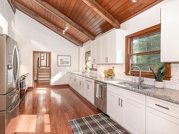 Splendid on Springdale! Sitting on 1 acre, this remodeled split-level is the perfect mix of modern while maintaining its original charm. A vaulted foyer leads into a brand new kitchen with expansive counter space and cabinetry, a separate dining room, and one of two living spaces (all on the main floor). Upper floor boasts of those same vaulted ceilings in all three bedrooms. Great primary suite with a walk-in closet, stunning primary bathroom, and a private deck perfect for cool fall nights! Two additional bedrooms and an upgraded bathroom complete the upper level. Lower floor is a host's dream with a gorgeous brick fireplace, wet bar, additional bedroom, office/flex room, third full bath, and a walkout patio. With an excellent floor plan like this, possibilities abound! Don't miss the conditioned workshop space through the garage!