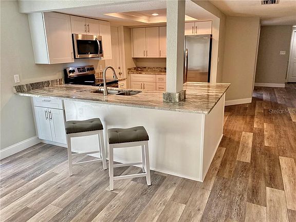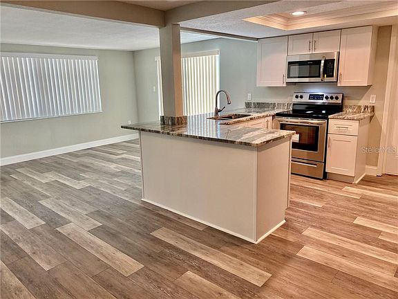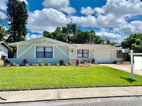 COME LIVE THE FLORIDA LIFESTYLE!! 3/2/1 Beautifully updated home. There is excellent attention to detail in this home. This home features a custom kitchen with exotic granite counter tops, large breakfast bar, white shaker cabinets, new stainless steel appliance package, high-end fixtures, and recessed lighting. The main living area has beautiful waterproof weathered grey wood/vinyl floors. Both gorgeous bathrooms have marble counter tops, wood vanities, high-end fixtures and 18"x18" porcelain tile. The showers have Porcelain tile with marble accented inlays and high-end fixtures. This home has a lot of attention to detail with 6-panel doors, 5 1/4 in. baseboards, new window treatments, neutral carpet in bedrooms, ceiling fans and fresh new paint inside and out. The roof on this home is new(2020). The front yard is freshly landscaped with fresh sod, plants and mulch. It is a MUST SEE. DON'T MISS THIS ONE