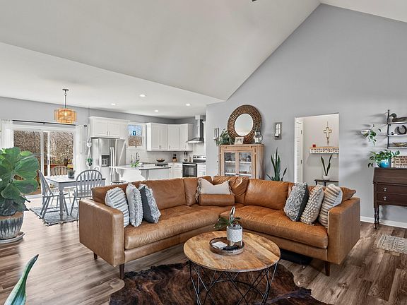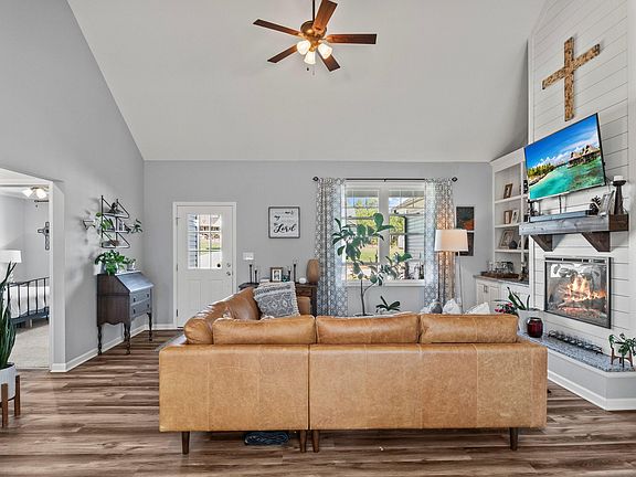 Welcome Home! This awe-inspiring 3-bedroom ranch boasts 2 full baths and a desirable split floor plan, offering both space and privacy. Step into the spacious living room featuring cathedral ceilings, built-ins, and a cozy shiplap fireplace, perfect for relaxing or entertaining guests. The main living areas feature durable LVT flooring, complemented by granite countertops, a modern-design tile backsplash, white cabinetry, and a beautiful range hood in the kitchen. The large kitchen island provides ample space for meal prep and casual dining. The spacious primary suite includes dual sinks, a walk-in shower, a water closet, and an oversized walk-in closet, offering a private retreat. Additional highlights of this home include a professionally epoxied floor in the 2-car garage, adding durability and aesthetic appeal. The whole-house Kinetico Filtration System + reverse osmosis on the kitchen sink ensure clean and pure water throughout the home. The fabulous mudroom with a drop zone keeps things organized, while the large laundry room with a folding table adds convenience. Step outside to enjoy the great covered front porch or the deck which overlooks the private backyard with fire pit, providing the perfect setting for outdoor gatherings or peaceful moments. Don't miss this opportunity to own a truly exceptional home!