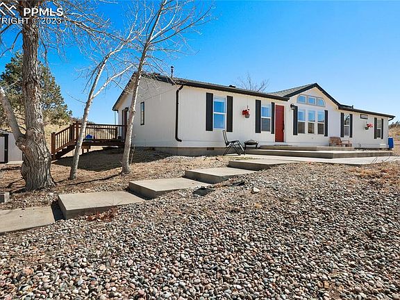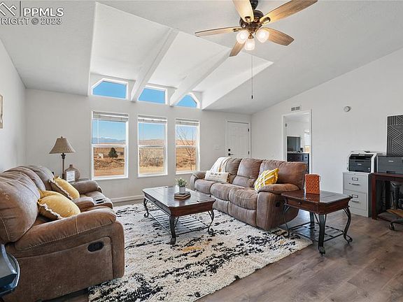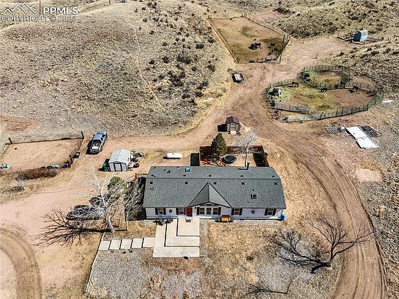 Enjoy country living w/all the city amenities nearby! Upgraded 4BR, 2BA home nestled on a 5.3-acre, horse-zoned corner lot, located on the outskirts of Fountain in the serene rural community of Villa Casitas. This home offers the perfect blend of tranquility & convenience. As you approach the front entry, you'll be greeted by a tiered concrete walkway that leads you into the bright & open floor plan of the home. Vaulted ceilings & large living spaces create an inviting atmosphere, perfect for entertaining. Stay comfortable year-round w/central air, lighted CFs, & propane heat. The Primary BR, located off the entry, offers a private sanctuary w/walk-in closet & a luxurious remodeled bathroom. Access to the Laundry Rm adds to the functional layout of the home. The Living Rm boasts fabulous Peak & MTN views through a large window, & skylights that flood the room w/natural light. The Living Rm flows into the Dining Area & Fam Rm, which features a gas-log FP w/brick surround & new mantle, adding a cozy ambiance to the space. Walk out to the backyard patio. The remodeled Kitchen boasts a new sink & painted cabinets w/butcher block wood countertops w/ a natural edge. SS appl incl a gas range oven, vent hood, new dishwasher, & Samsung French door refrigerator. The adjacent Laundry Rm offers access to the side entrance & small wood deck w/wrought iron rails. Washer/Dryer included. 3 more BRs share a full bathroom. The backyard is perfect for outdoor fun & relaxation, w/ a new fence ensuring privacy & security. The property also features fruit trees, a shooting range, 3 sheds, (1 w/electricity & 1 that has been converted into your very own chicken coop - chickens not included). With plenty of room for RV parking, corrals for your horses, & pens for your other animals, this property offers endless possibilities for the outdoor enthusiast or animal lover. Convenient location, just 1 mile from I-25 & a short 15-min drive to Fort Carson. Easy commute to Colorado Springs & Pueblo.