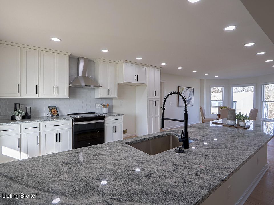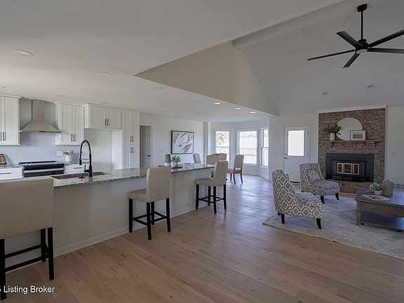 Step inside to be greeted by an impressive open floor plan, ideal for entertaining. The vaulted ceiling family room, featuring a cozy fireplace, flows seamlessly into the chef's kitchen and dining area. The kitchen is a showstopper, boasting white shaker cabinetry, granite countertops, a subway tile backsplash, stainless steel appliances, and lots of storage with tall cabinets. A massive nearly 15-foot gorgeous breakfast bar with barstool seating provides the perfect gathering space. The dining area, enhanced by a charming bay window, offers stunning views of the serene property.