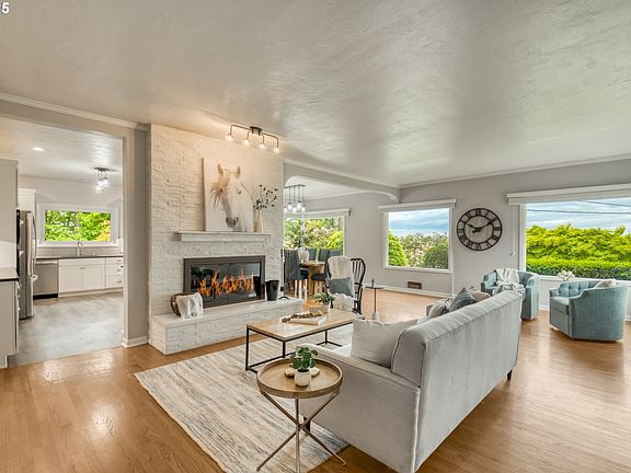 Mid-Century Magic with Iconic Mt. Hood Views. Set on a rare, private 1.3-acre retreat at the end of a quiet dead-end street, this home backs to a natural wooded area and offers a peaceful, Zen-like atmosphere surrounded by gardens, flowering shrubs, and visiting wildlife. Though it feels a world apart, you're just minutes from parks, top-rated schools, and everything Happy Valley has to offer.Framing the natural beauty are expansive, unobstructed views of Mt. Hood, Mt. St. Helens, and even Mt. Adams on clear days—turning everyday moments into something extraordinary. At 3,484 square feet of total living space, the home offers 2,527 square feet on the main floor with minimal steps. This 1951 mid-century gem blends timeless charm with thoughtful updates. Hardwood floors, a wood-burning fireplace, oversized windows fill the home with light and calm. The kitchen is as functional as it is stylish, with quartz counters, gas appliances, built-ins, pantry, and wine fridge—all appliances included. A convenient utility room is also located on the main level. All three bedrooms and two full baths are on the main floor, including a serene primary suite with soaking tub, walk-in shower, and walk-in closet. The 957-square-foot basement has high ceilings and has untapped potential, offers flexible space for your vision. Plus, enjoy the best of Happy Valley living—summer concerts, movies in the park, 4th of July fireworks, and year-round community events are all just minutes away. Take the tour for more pictures and open May 17th, Saturday 12 pm to 2:30 pm