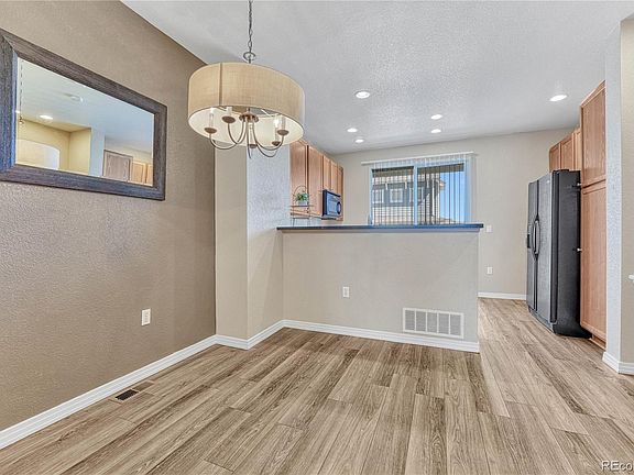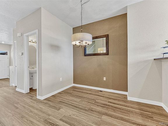 This beautifully updated 3-level, 3br/3.5ba townhome in Parker’s Highlands at Stonegate community includes a 2-car attached tandem garage, views to the pool, and plenty of living space. Luxury vinyl planking throughout the main floor along with neutral paint and carpeting create an on-trend base for this unit. The living room has large windows looking down to the front courtyard and balcony, a ceiling fan for airflow, and a gas fireplace for chilly winter nights. The dining, kitchen, and half bath are located a few steps above the living room, offering separation without losing the ability to interact. The kitchen has plenty of storage and counter space with dark counters, wood cabinets, stainless steel sink, a range with an overhead microwave, and a large fridge. The back balcony with a sliding door lets in the morning sun and has views of the nearby community pool. Upstairs, a primary suite includes a walk-in closet and an attached bathroom with dual sink vanity and an oversized tub/shower combination. The second bedroom also has an attached bathroom with a shower and single sink vanity. Separating the bedrooms is a laundry closet with a washer and dryer. In the basement, a third bedroom with an attached full bathroom has a shower/tub combination. Located in a vibrant community of over 440 individually owned condominiums, this unit has easy access to its own pool as well as the pools, parks, and tennis for the Stonegate community. Shopping, and dining in Lone Tree, Parker, and beyond are a breeze via Lincoln Avenue to freeways and Parker Road. Enjoy low-maintenance condo living in the Highlands at Stonegate.