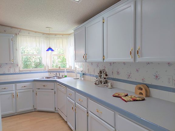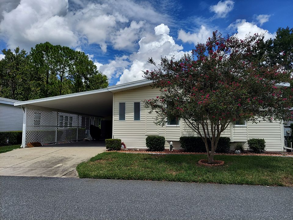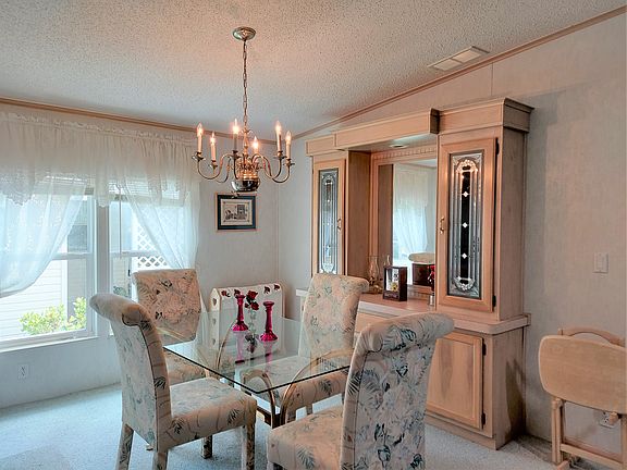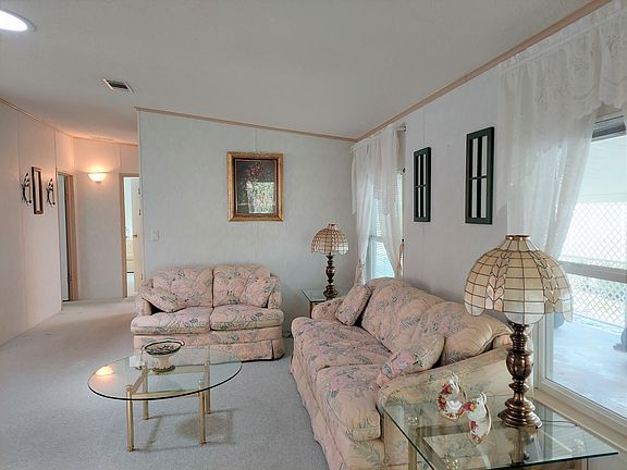 1994 Palm Harbor with 2 bedrooms, 2 baths sits on a beautiful pond lot with not only a screened-in lanai and partially paved patio, but an air conditioned Florida room with glass windows over-looking water and woods, providing an amazing stage for all of the wildlife! With 1250 square feet of living space, this open floor plan offers carpet in the living areas, laminate flooring in the kitchen and vinyl in baths, crown molding, Thermopane windows, and ceiling fans. In the spacious kitchen you have plenty of cabinet and counter space, and tile back splash. The master bedroom has enough room for a king set plus a walk-in-closet. Master bath includes a garden tub, single vanity and walk-in shower. The full guest bathroom has a new commode and Jack & Jill door that leads you to the entryway/office space. The dryer and washer, which has a separate hot water tank, are located in the over-sized shed, which includes loft shelving. This home is being offered furnished with the cart!