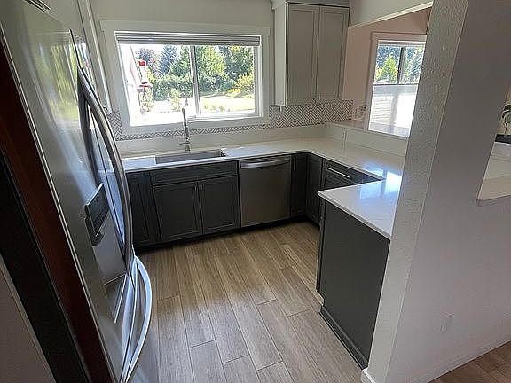 This captivating and affordably priced 3-bedroom, 1.75-bath home— extensively remodeled in 2020—blends mountain charm with modern comfort. Featuring a chalet-style design, the home showcases vaulted ceilings upstairs and 10-foot ceilings on the main level, with open beams and tongue-and-groove pine that beautifully frame the surrounding views of Icicle Ridge and Tumwater Mountain. Inside, you'll find: • A bright, open-concept living area with stylish lighting • Wood-grain laminate flooring in kitchen, bathrooms, living areas, & laundry room • Custom tile accents in the kitchen and bathrooms • Spacious carpeted bedrooms and updated bathrooms The private backyard is a peaceful retreat, with a lush lawn bordered by mature trees and shrubs for added privacy. Enjoy outdoor living on the cozy composite deck with built-in bench seating—perfect for entertaining or relaxing. Adjacent to the deck is a gravel patio area pre-wired with 240V for an outdoor spa. A large detached two-car garage offers ample storage space with cabinetry, a workbench, and open rafter ceilings. 2020 remodel details include new plumbing, electrical, composite deck, kitchen & baths, flooring, doors, windows, and trim. Landscaping & an upgraded drainage system including new gutters were added as well along with snow breaks and heat cables on the roof. Location perks: • Just down the street from river access at the Wenatchee River boat launch • Only 1.2 miles to downtown Leavenworth’s shops, dining, and festivals Whether you're seeking a full-time residence or a vacation home, this property delivers the best of mountain living with convenience and style.
