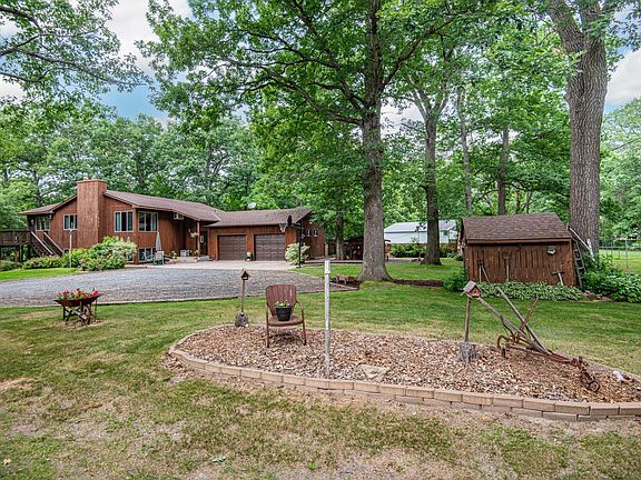 4BR/2BA home with cozy cabin feel and lots of spacious rooms - including great porch area and several storage sheds. Mature trees and perennial gardens. Bright living room with corner windows and gas fireplace. Spacious kitchen with a lot of cabinets space, large snack bar and built-in desk. From the dining room is the 4-season porch with knotty pine walls and attached deck. Both main floor bedrooms have double closets. Finished basement features an L-shaped family room, 2nd gas fireplace with large hearth, unique wainscoting made from power poles and "outhouse" mechanical closet, two additional bedrooms, and a huge storage room. Large foyer with a big laundry room on the entryway level. Three outbuildings including a finished workshop. New roof in 2017. Convenient location with quick freeway access and easy commute to the cities, with several lakes in the area, plus close to in-town conveniences. Call to arrange a private showing.